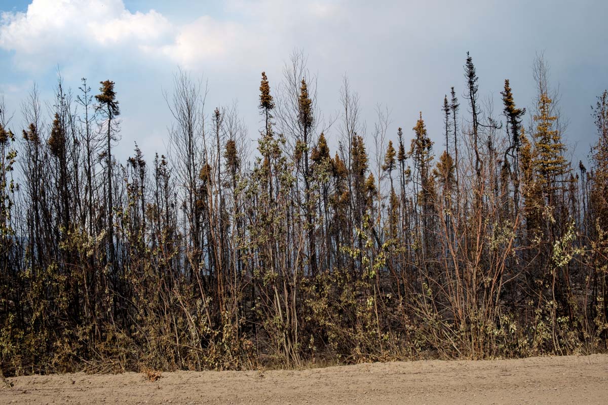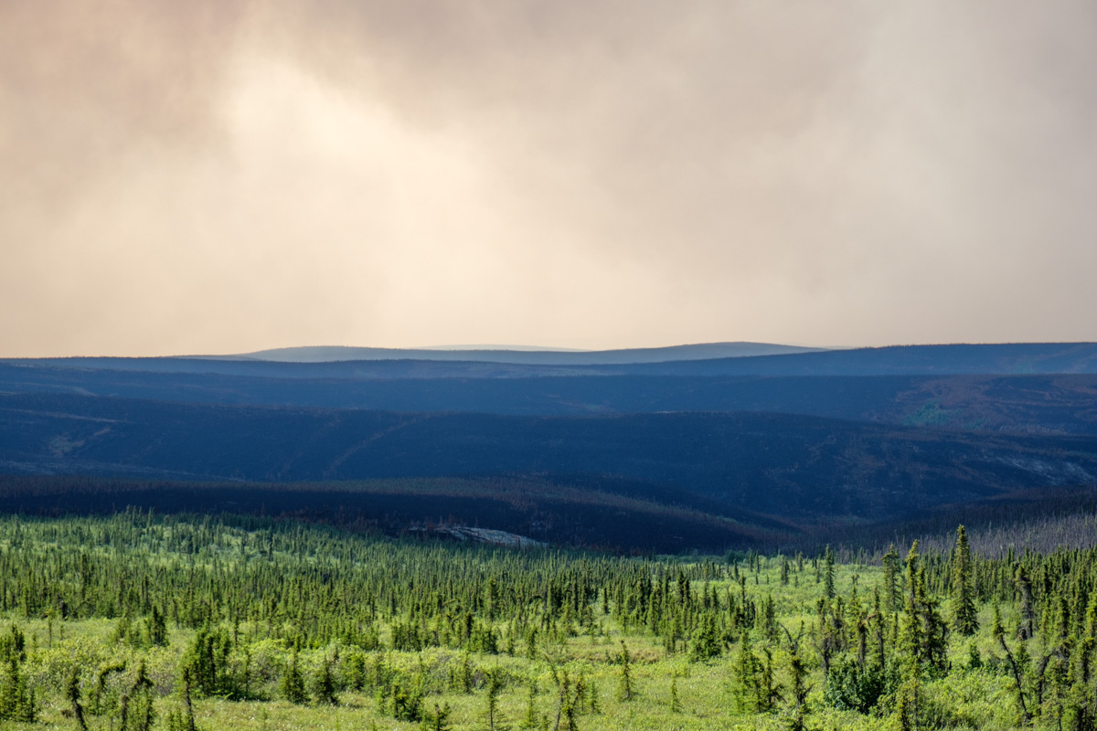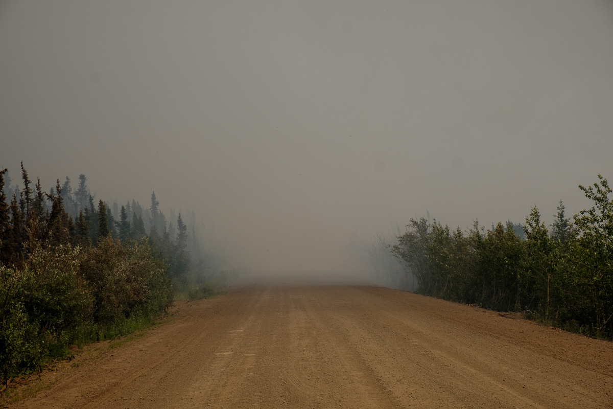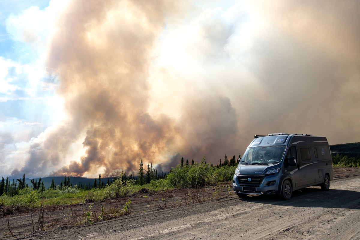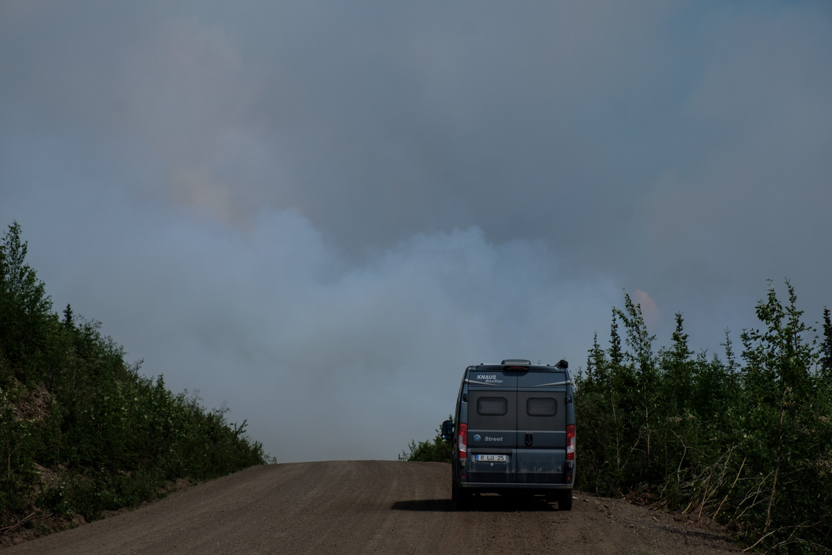 Es ist wunderschönes Wetter als wir weiterfahren, die Straße ist immer noch ganz gut zu fahren, es sind viele Fahrzeuge unterwegs. Als es zum Eagle Plains hochgeht, riechen wir das Feuer, dann sehen wir Waldbrände. Uns wird etwas mulmig, aber