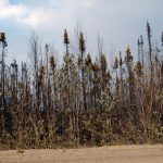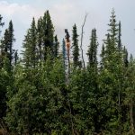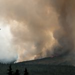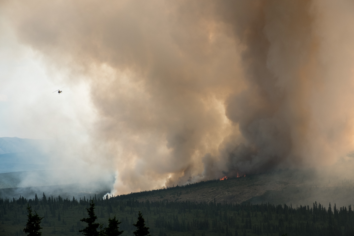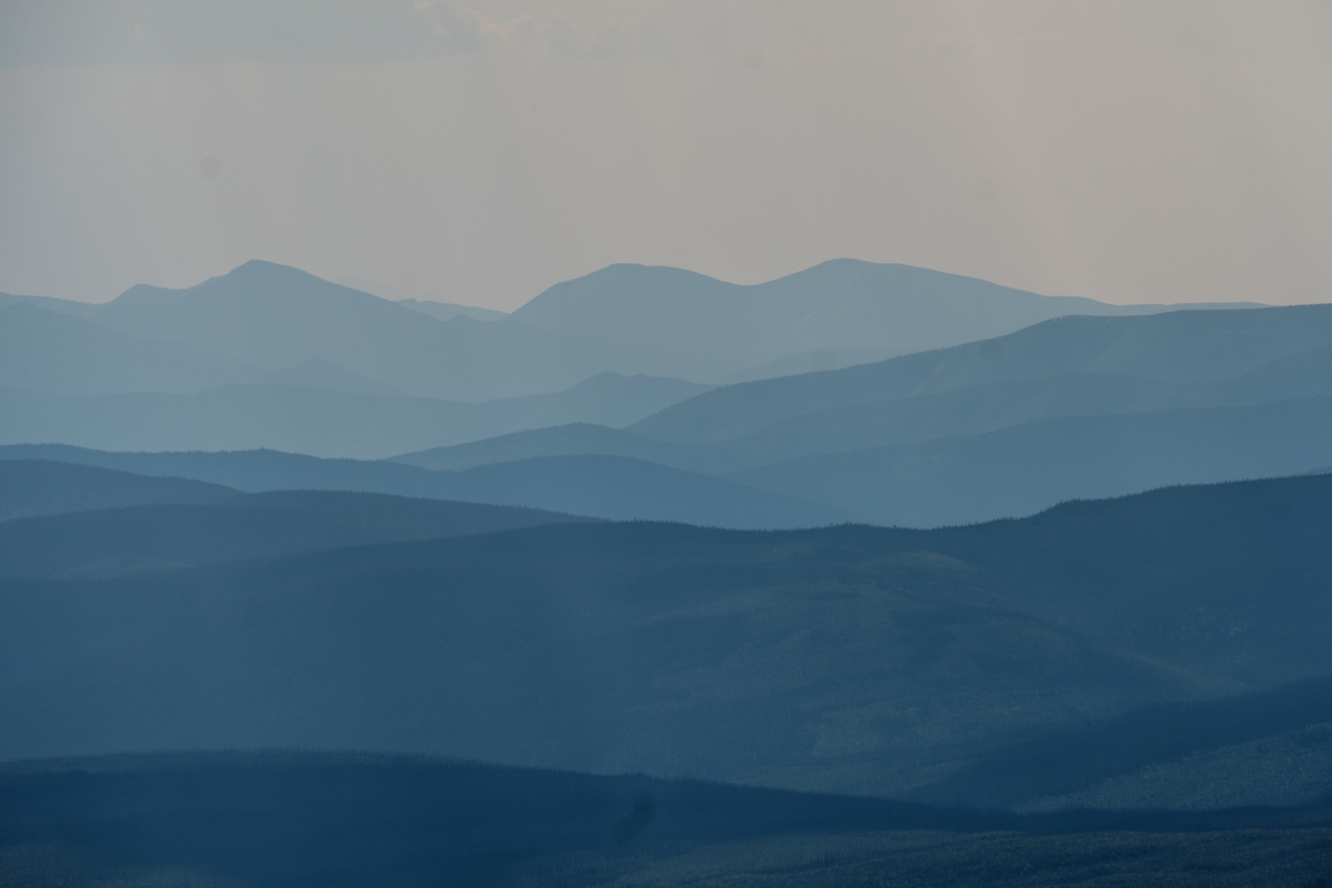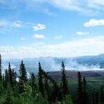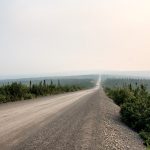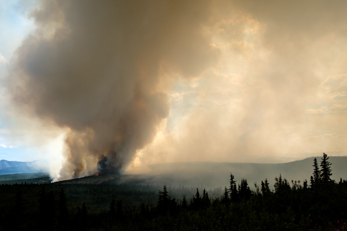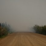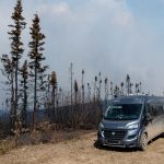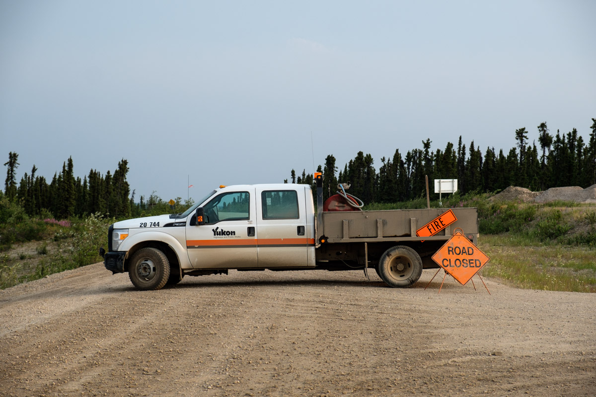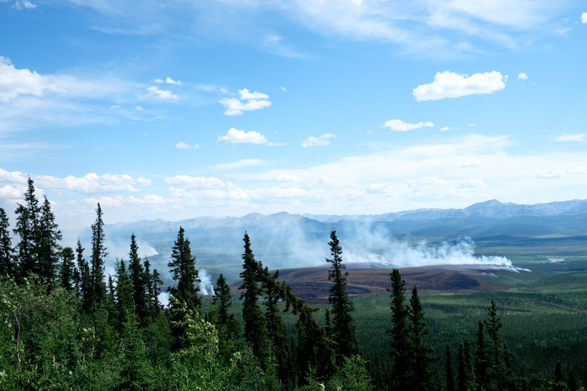 Es ist wunderschönes Wetter als wir weiterfahren, die Straße ist immer noch ganz gut zu fahren, es sind viele Fahrzeuge unterwegs. Als es zum Eagle Plains hochgeht, riechen wir das Feuer, dann sehen wir Waldbrände. Uns wird etwas mulmig, aber
