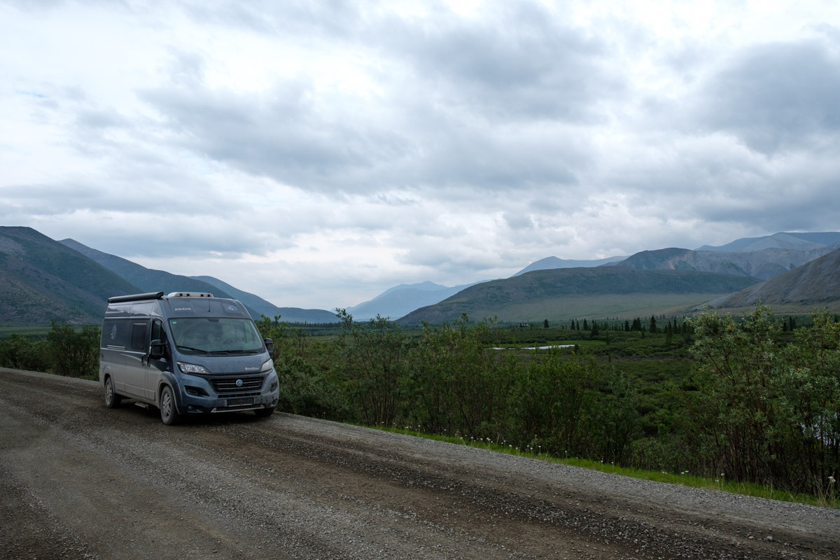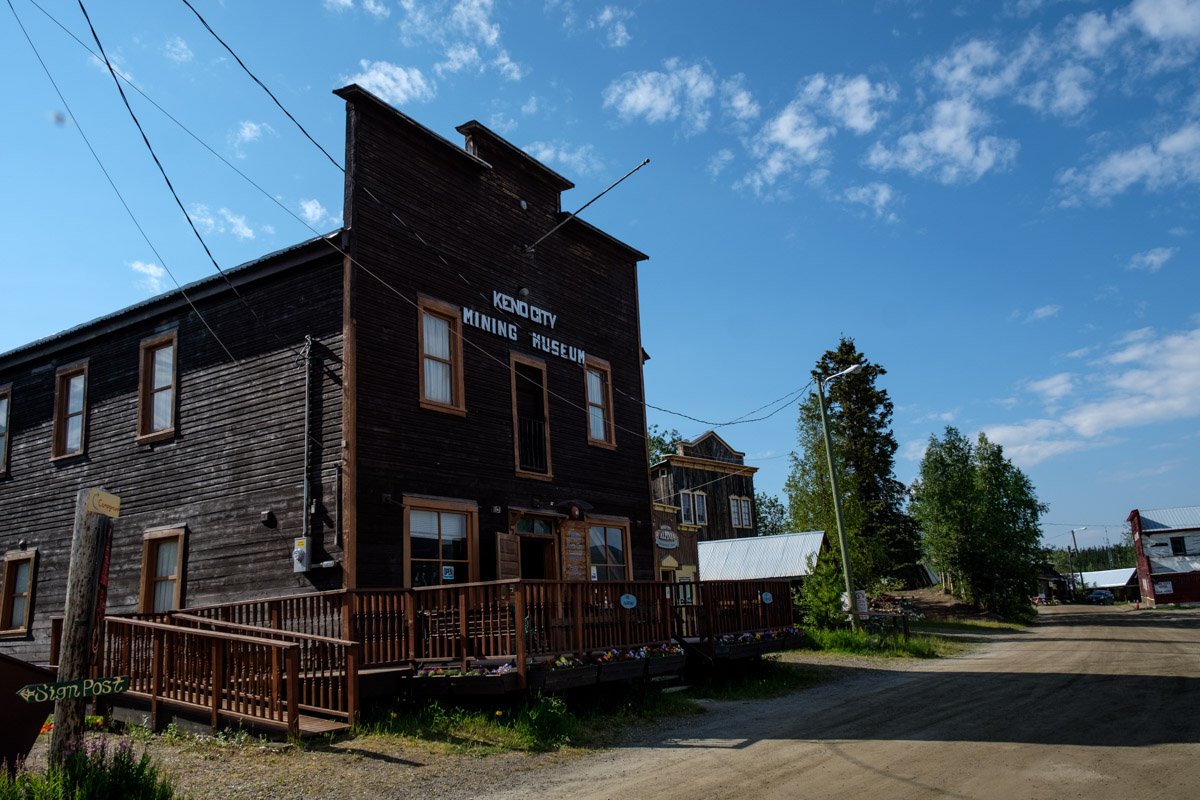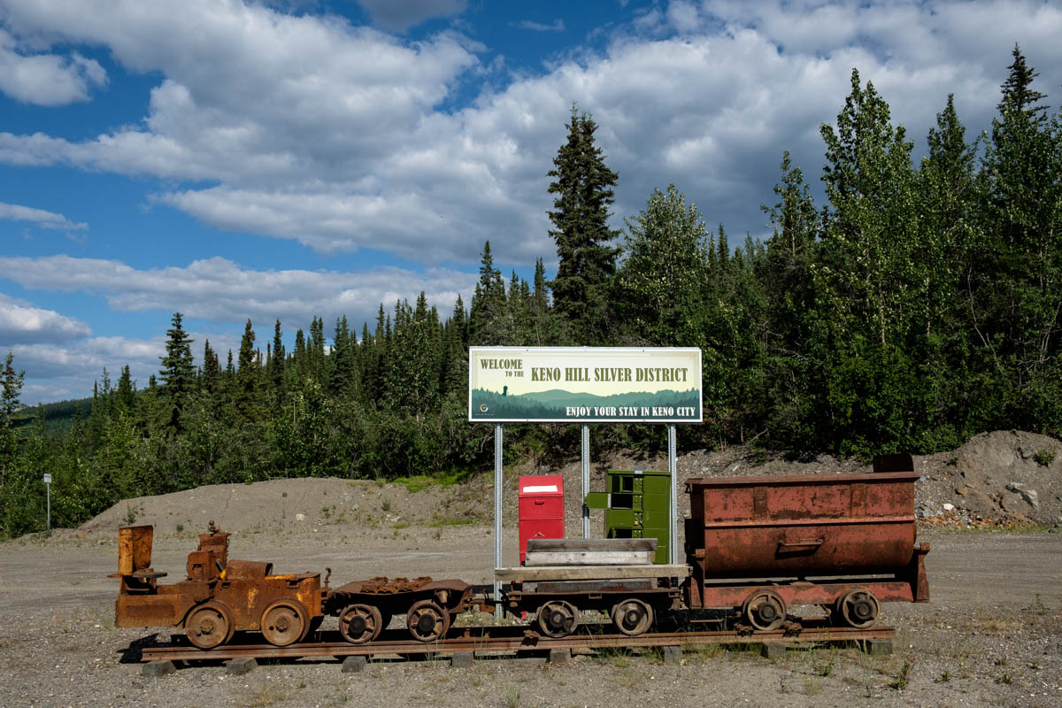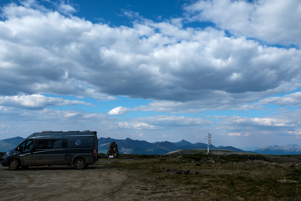 Als Test für den Dempster Hwy beschließen wir spontan vorher noch den Silver Trail bis nach Keno zu fahren. Bis Mayo ist die Straße geteert, danach nur noch Schotterpiste, aber auch gut zu fahren. Bei dem Keno Signpost hat man eine gigantische Aussicht, wir bleiben über Nacht stehen, weil ich endlich sehen möchte wann es denn dunkel wird. Gegen ein Uhr bin ich ins Bett, es ist immer noch hell.