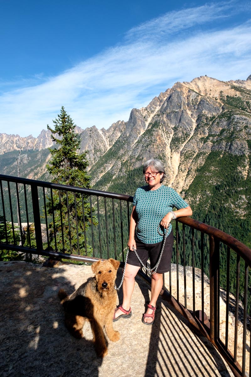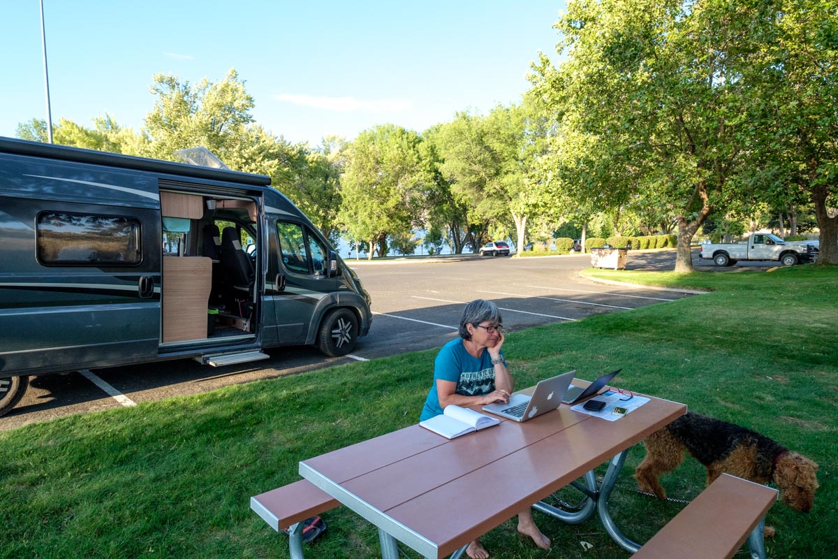 Im North Cascades NP informieren wir uns zuerst im Visitorcenter ob man mit Hund auf die Trails darf. Wir erfahren dass es kein Problem ist es geht nämlich mitten durch den Park entlang der Stauseen eine Recreation Area. Diese Stauseen und Kraftwerke versorgen Seattle mit Strom. Am Rainy Pass geht Pacific Crest Trail vorbei. Ein paar km sind wir ihn auch gewandert, haben junge Schweizer getroffen, die ihn ganz gewandert sind. 4 1/2 Monate haben sie bis hierher gebraucht! Wir fahren mit dem Auto weiter. In Twisp haben wir auf einem privaten RV Platz übernachtet. Mal wieder richtig duschen, Wäsche waschen und unbegrenzt im Internet surfen hat schon was.Am nächsten Tag bis Coulee Dam, ein riesiger Damm hat hier den Columbia River gestaut. Gleich dahinter kommt Grand Coulee, hier kann man zum Stausee runterfahren. Wir halten an, ruhen uns ein paar Stunden im Schatten aus, gehen baden und sogar die Ida darf hier ins Wasser.