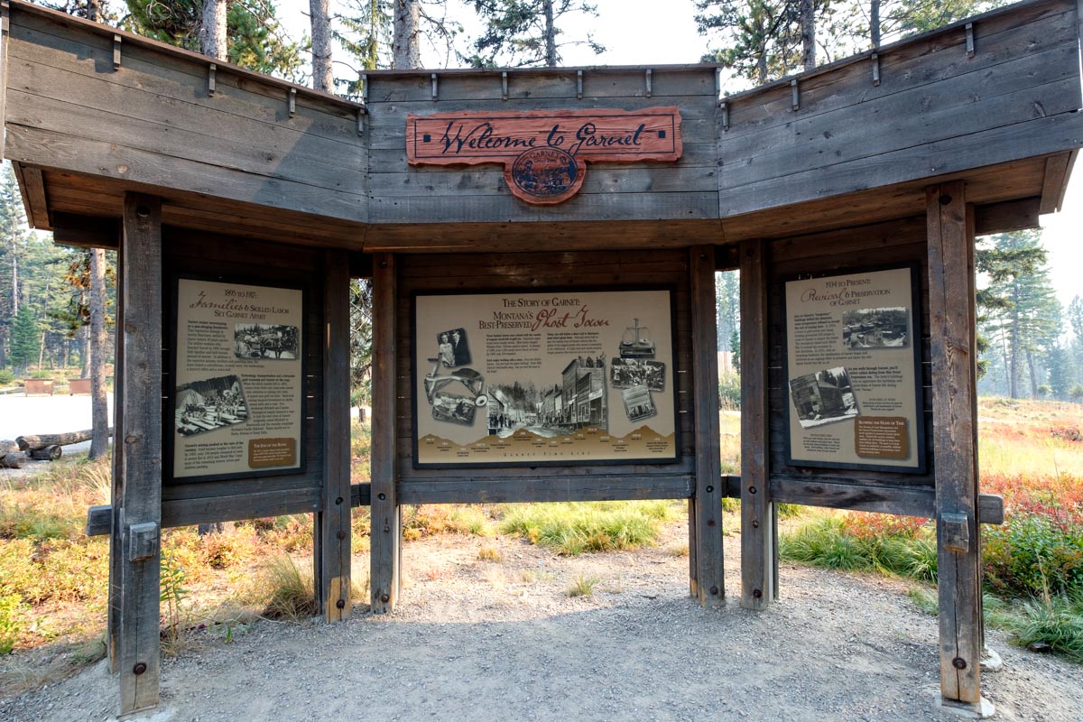 Am nächsten Tag sehe ich auf der Karte direkt neben der Interstate 90 eine ghost town eingezeichnet. Wir suchen sie. Dann sehen wir ein Hinweisschild „ghost town“ und zwar auf der anderen Seite der Autobahn, also suchen wir in dieser Richtung 15 Meilen lang. Dann sehen wir wieder ein Schild „ghost town“ aber in der entgegengesetzten Richtung. Jetzt packt uns der Ehrgeiz, wir fahren wieder zurück. Unter einem kleinen Schild „Garnet Gulch“ finden wir auch den Hinweis „Garnet ghost town“. Nach 10 Meilen übler, schmaler, staubiger Schotterstraße sagt das Navi im Nirgendwo „Ziel erreicht“. Ist das etwa eine Geisterstadt die nur alle 100 Jahre für 10 min auftaucht? Oder war die verfallene Hütte von vorhin schon unser Ziel? Wir fahren weiter, denn wir können eh nicht umdrehen. Nach zwei Kurven kommt ein Parkplatz und da stehen viele Autos! (Die sind von der anderen Seite gekommen) Man muß ein Stück laufen und dann sieht man den Ort in einem Talkessel.