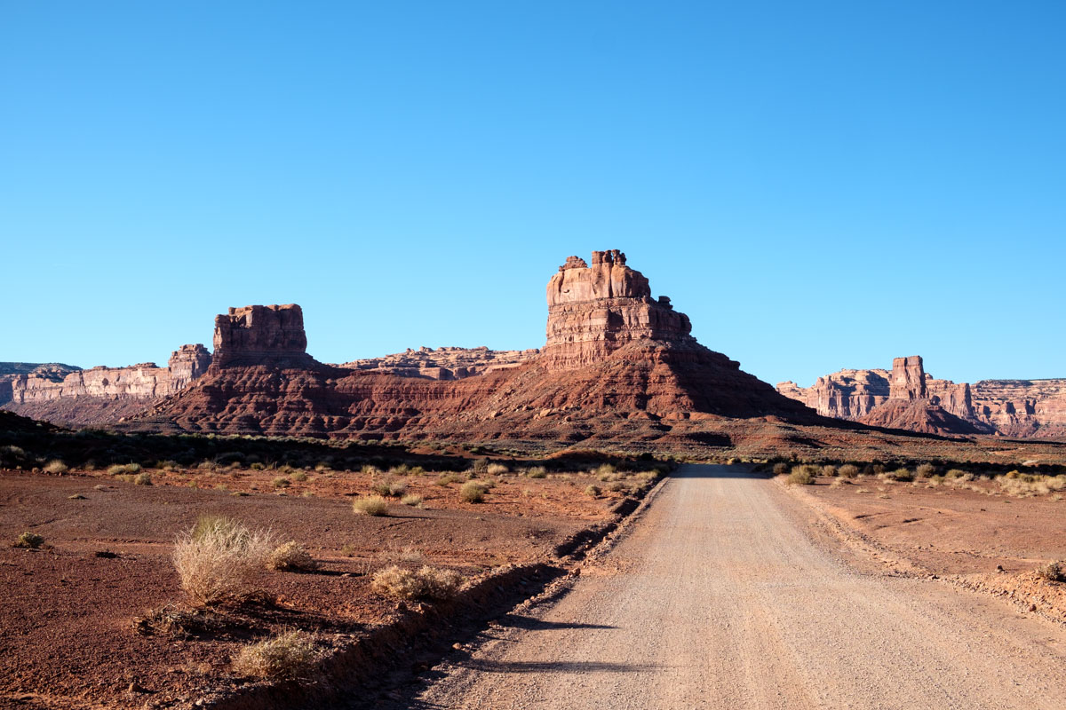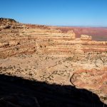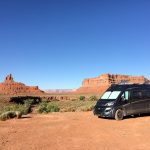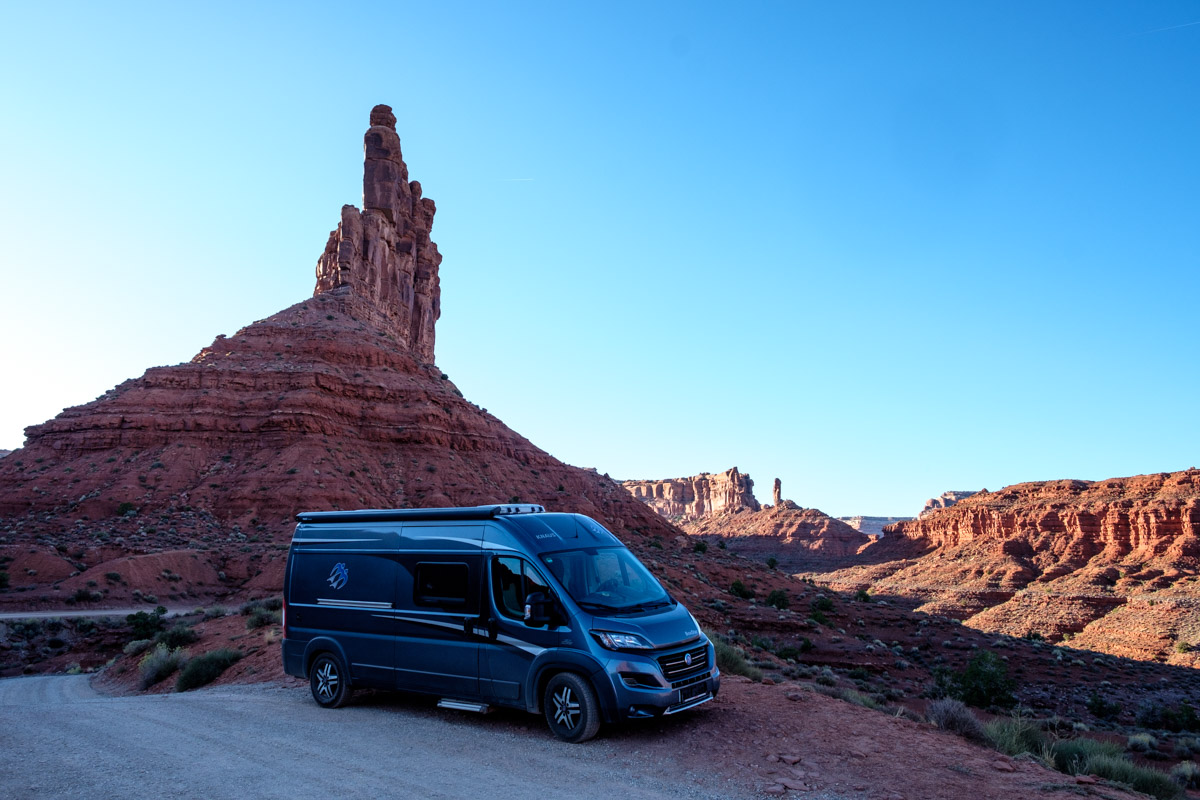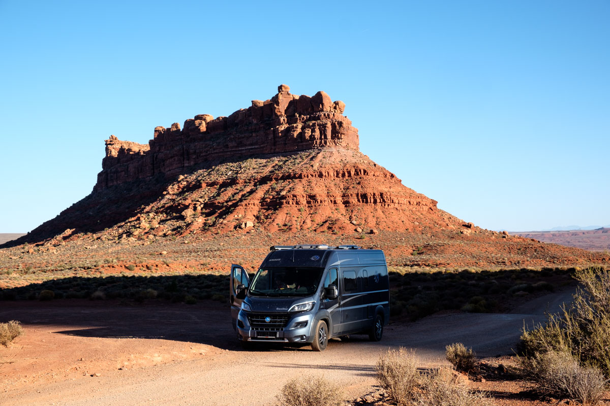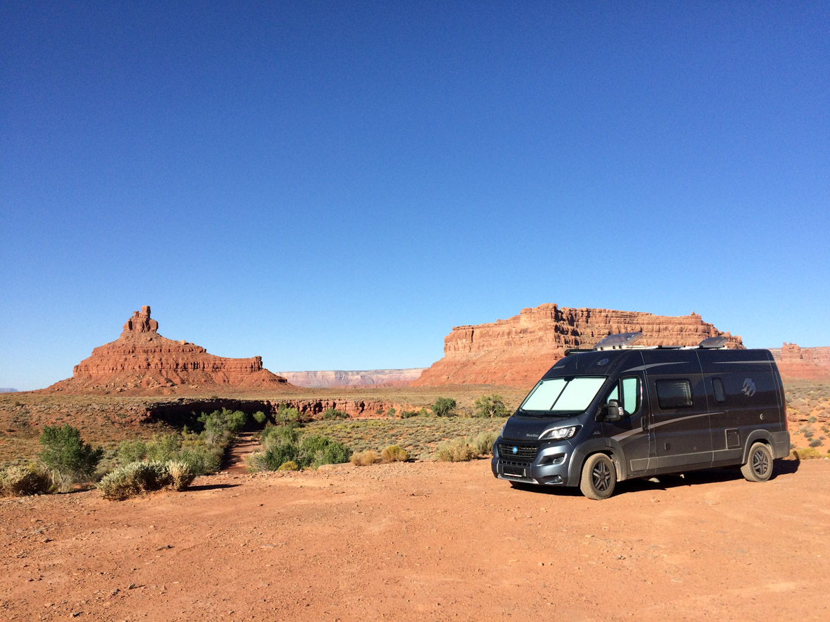 Gegen Nachmittag fahren wir die  nicht asphaltierten Serpentinen des Moki Dugway runter zum Valley oft he Gods. Unten angekommen zweigen wir auf eine Nebenstraße ab. Man kann sie nur im trockenen Zustand fahren, auch so ist sie eine Herausforderung. Die Landschaft dafür ist wirklich einmalig, besonders jetzt am späten Nachmittag leuchten die Felswände. Gegen 18 Uhr finden wir einen der schönsten Plätze, wir bleiben und genießen den Sonnenuntergang vor dem Wohnmobil, nachts sehen wir den schönsten Sternenhimmel.