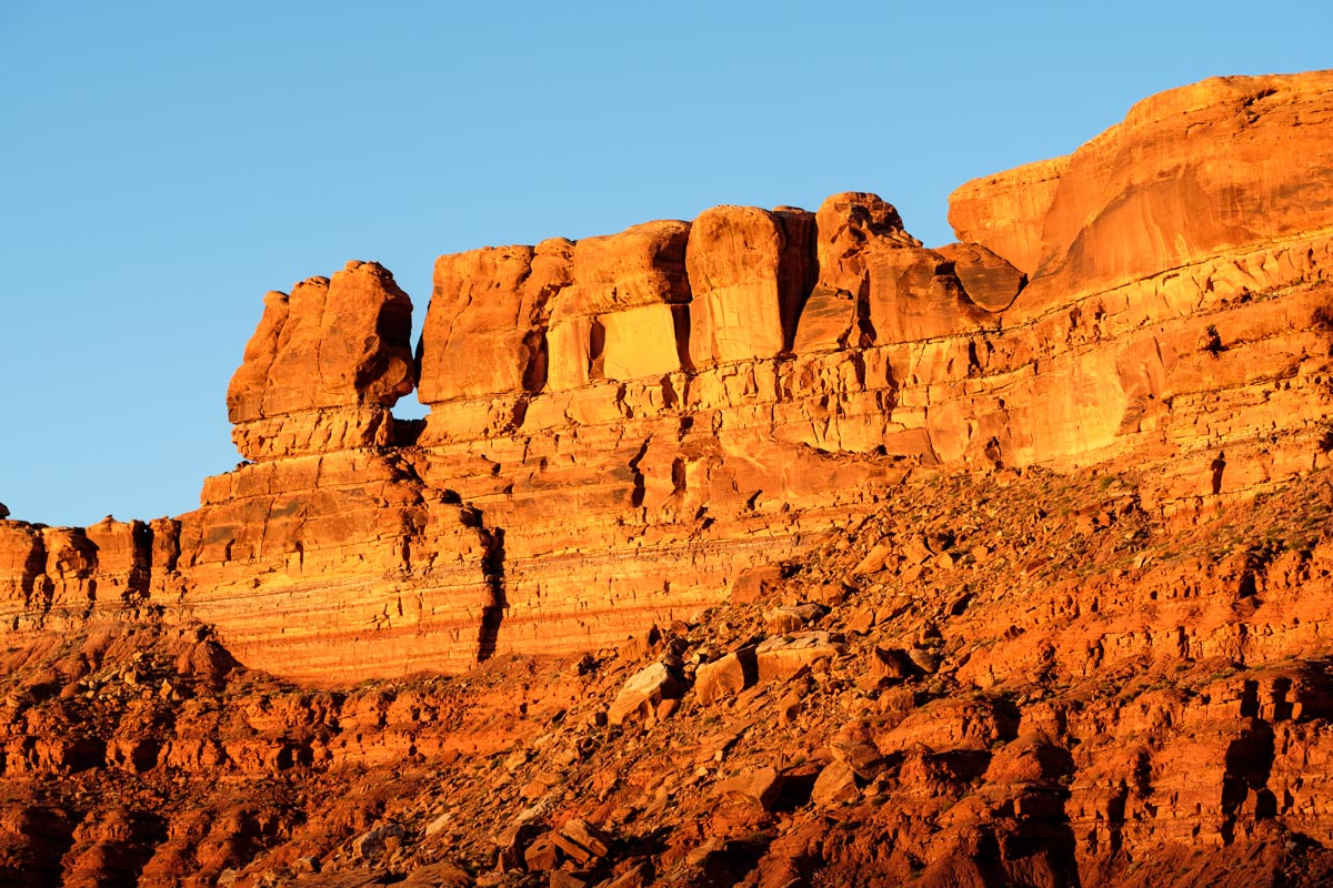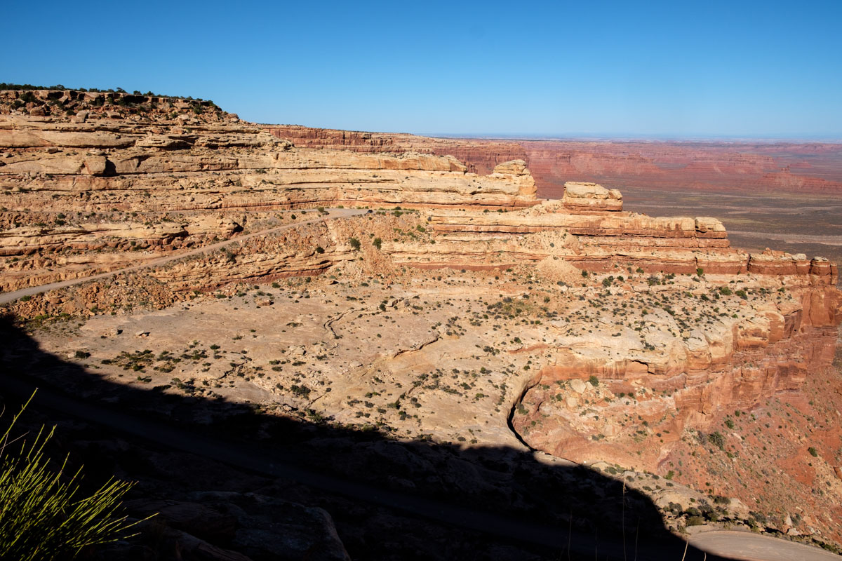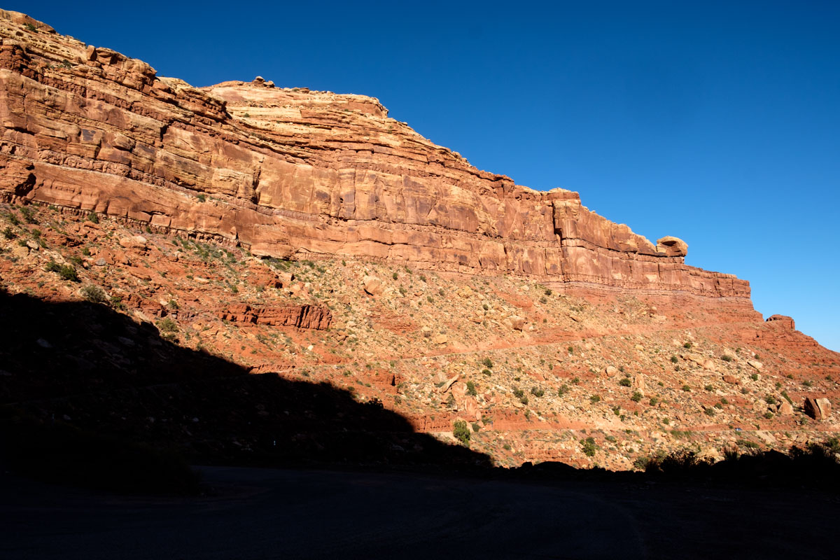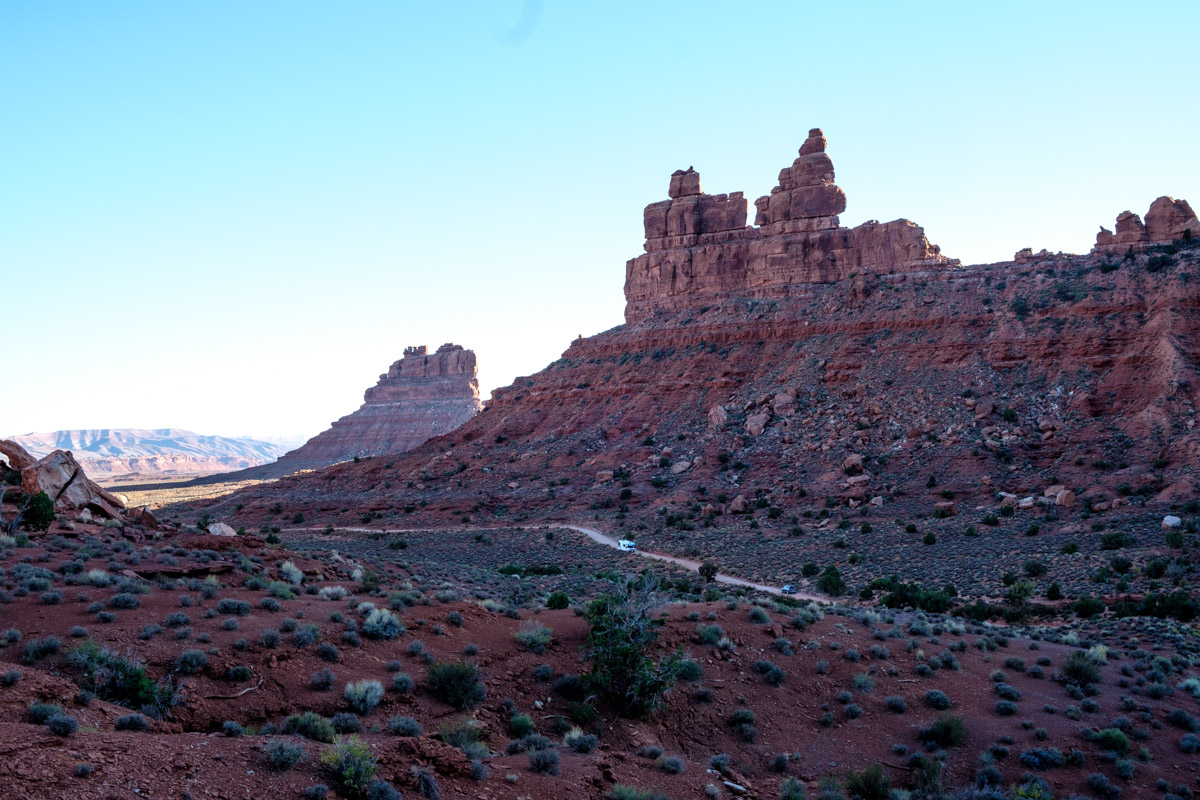 Gegen Nachmittag fahren wir die  nicht asphaltierten Serpentinen des Moki Dugway runter zum Valley oft he Gods. Unten angekommen zweigen wir auf eine Nebenstraße ab. Man kann sie nur im trockenen Zustand fahren, auch so ist sie eine Herausforderung. Die Landschaft dafür ist wirklich einmalig, besonders jetzt am späten Nachmittag leuchten die Felswände. Gegen 18 Uhr finden wir einen der schönsten Plätze, wir bleiben und genießen den Sonnenuntergang vor dem Wohnmobil, nachts sehen wir den schönsten Sternenhimmel.