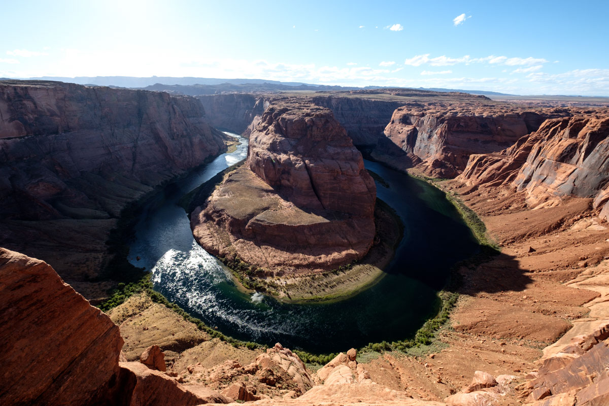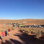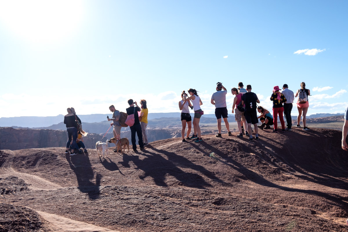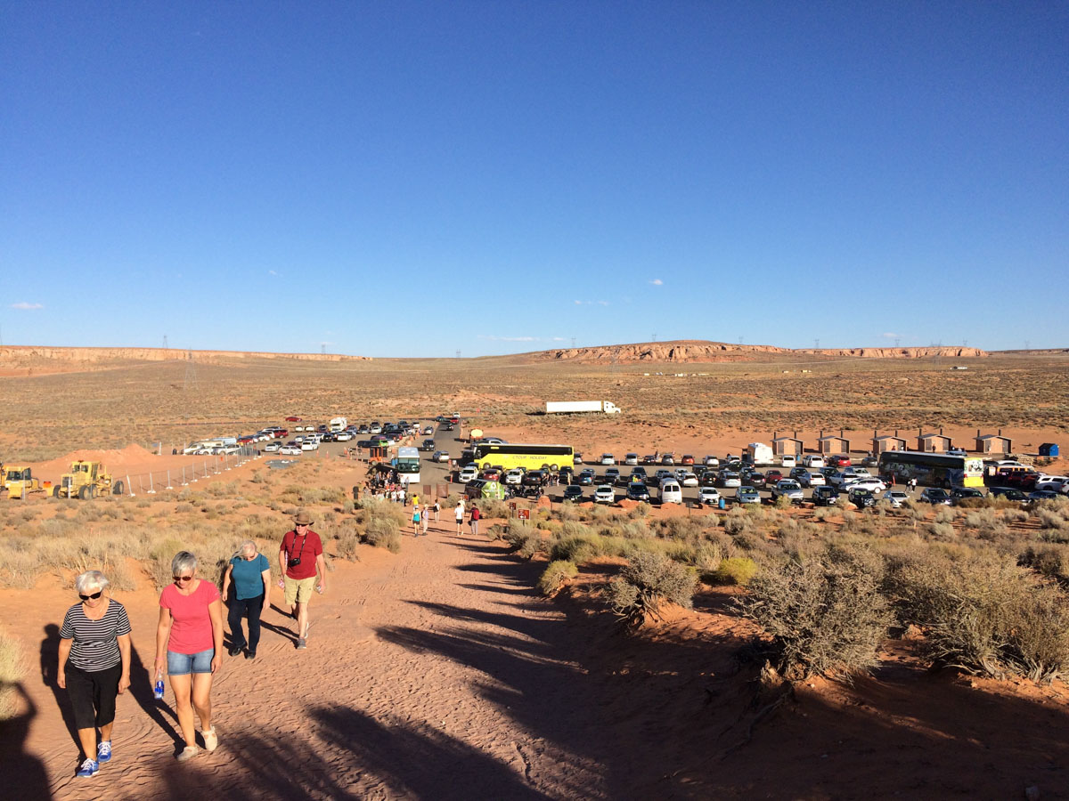 Gegen Abend sind wir in Page, am Horseshoe Bend. Die Touristenmasse hat uns wieder, gemeinsam mit vielen, vielen anderen gehen wir zum Aussichtspunkt an dem man die Schleife des Colorado tief unten bewundern kann. Genießen kann man die Aussicht nicht. Ich frag mich schon ob bei dem Gedrängel nicht ab und zu einer runterfällt.