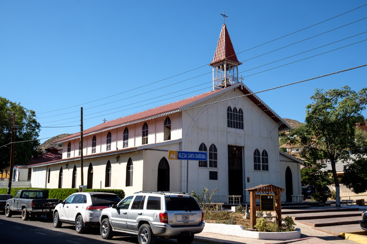 dann geht´s weiter bis zum Golf von California. Beim RV Park San Lucas Cove übernachten wir. Der ist wirklich in Ordnung, sauber, die Toiletten und Duschen würden zwar bei jedem deutschen Campingführer verrissen, aber für die Baja sind sie gut! Nur ist der Strand klein und außerhalb vom CP vollgemüllt. Wir suchen weiter. Da solls noch ein paar schöne Playas geben. Behauptet zumindest jeder den wir fragen. Aber vorher „frühstücken“ wir noch in dem CP Restaurant: Huevos Ranchero und Huevos Mexicana. Dann fahren wir noch den kurzen Weg zurück nach Santa Rosalia, eine Stadt die ihre Entstehung einer Kupfermine verdankt. Hier besichtigen wir die Iglesia Santa Barbara, eine Stahlkonstruktion die von Gustave Eiffel entworfen wurde. Anschließend noch ein Bummel durch die Stadt, dann fahren wir weiter Richtung Süden.