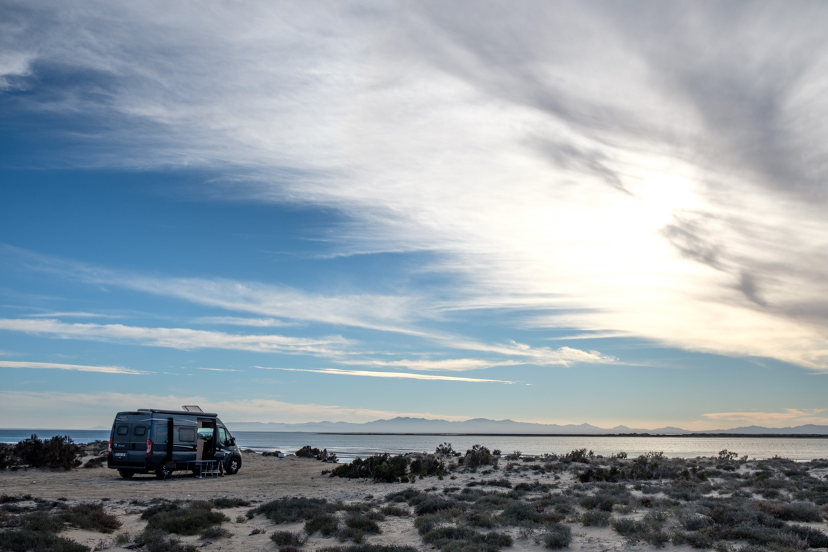 Mittag sind wir schon in Ojo de Liebre. Zu der Walstation fährt man durch die Salzgewinnung. Der Campingplatz ist riesig, er zieht sich ungefähr 3 km am Strand entlang und außer uns sind nur 5 Autos da. Es ist eindeutig noch Vorsaison. Trotzdem, morgen machen wir uns auf zum Whalewatching!